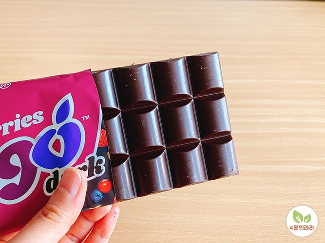 상큼한 유기농 베리가 3종 블루베리, 크랜베리, 라즈베리와 아몬드, 헤이즐넛 칩이 들어 있어 맛이 새콤하고 씹을수록 여러가지 맛을 느낄 수 있었습니다. 개인적으로 견과류가 들어간 초콜릿을 좋아하는데, 베리까지 들어가니 맛이 상큼해서 여성분들이 특히 더 좋아할 것 같아요. 기분이 좋아지는 맛입니다. ^^