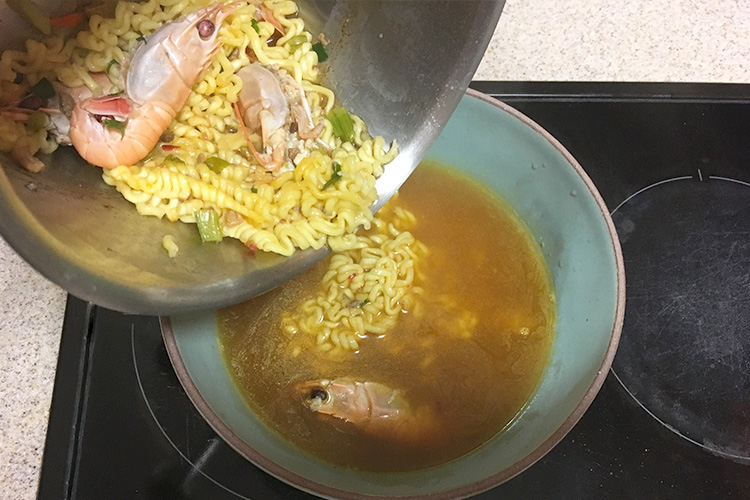 라면스프는 반만 넣고, 면을 이어서 넣어주세요.