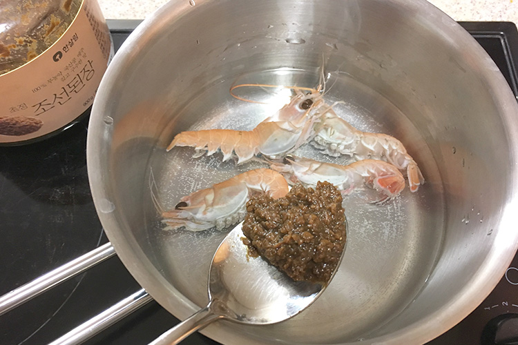 먼저 물에 된장을 좀 풀고 딱새우를 넣어 끓여 줍니다.