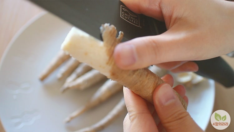 그리곤 더덕을 잘게 찢어주세요. 방망이로 내려쳐서 찢기 쉽고, 더덕이 한결 부드러워졌습니다.