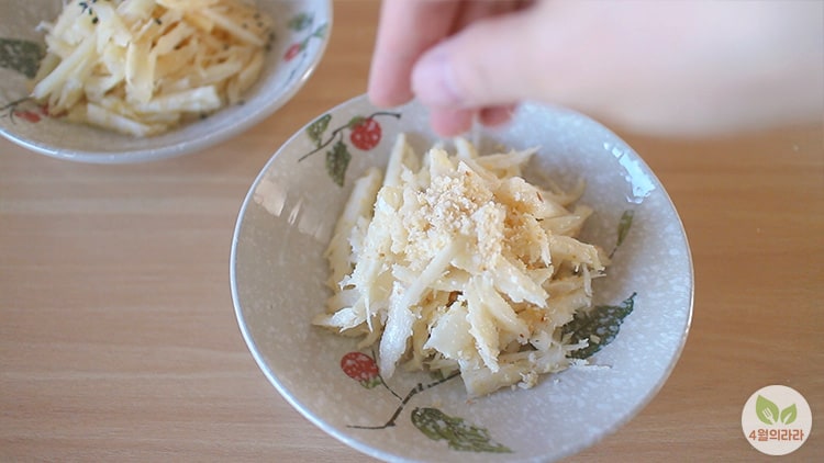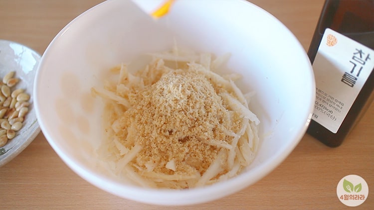 3. 더덕에 잣가루와 참기름을 넣어 무친 후 소금을 넣어 간을 한다.