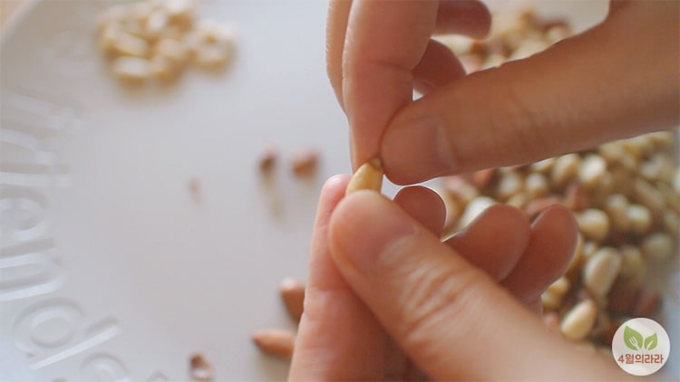 저는 더덕무침에 잣가루를 넣을 거에요. 껍질이 있는 황잣을 이용했는데, 황잣은 껍질이 붙어 있는 잣으로 끓는 물에 넣지 않아 잣 고유의 향과 맛이 강합니다. 잣의 껍질을 벗기로 마지막 꼬깔부분까지 모두 벗겨 주세요. 그리고 물로 두어번 씻어낸 뒤 볶아줍니다.
