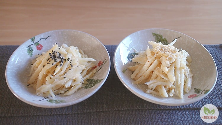 반은 참기름을 두르고 팬에 볶아봤습니다. 소금과 육수를 넣어 부드럽게 볶다가 어간장을 넣어 감칠맛을 더해주면 완성~ 오래 볶을 필요도 없으니 생각보다 간단한 더덕볶음입니다.