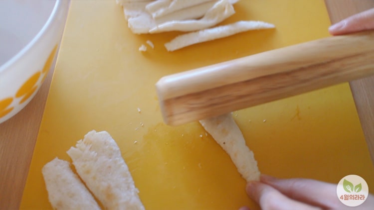 더덕의 껍질을 다 벗겼으면 얇게 찢기 위해서 방망이로 더덕을 칠 텐데요. 전 밀대를 이용했고, 밀대 가운데 부분을 이용해서 더덕을 쳐 줍니다. 밀대 끝부분으로 치면 더덕이 조각조각 나니 꼭 가운데 부분으로 적당히 내리쳐 주세요.