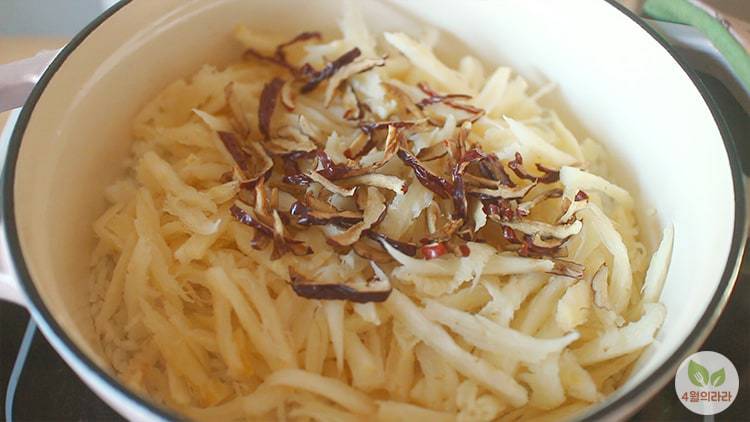 2. 팬에 참기름을 두르고 더덕을 볶다가 소금과 육수를 넣어 부드럽게 볶는다.