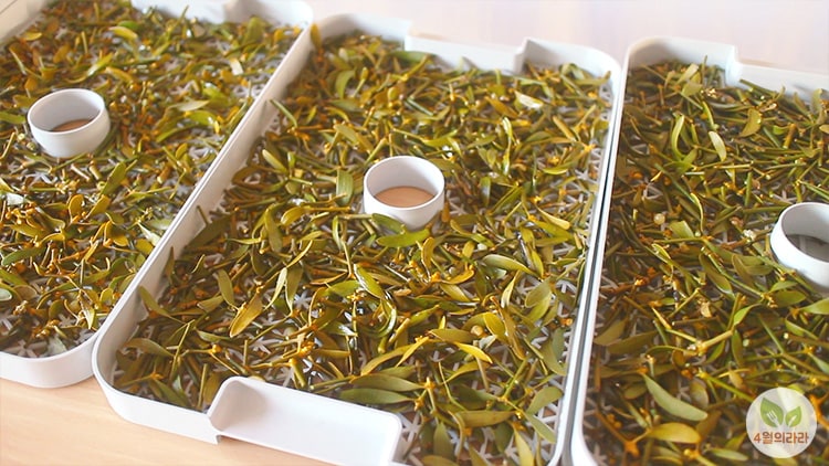 2. 겨우살이를 작게 잘라 건조기(35도, 24시간)를 이용해 말린다.
