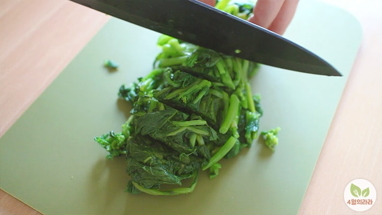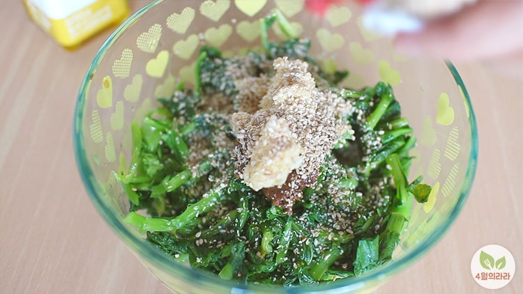 데친 유채를 먹기 좋은 크기로 자르고 양념을 넣습니다. 된장과 개복숭아청, 마늘과 통깨를 갈아넣어 무쳐주세요. 개복숭아청 대신 매실청이나 조청을 넣으면 좋고, 없다면 빼셔도 유채만의 고유한 맛을 그대로 느낄 수 있어 괜찮습니다.