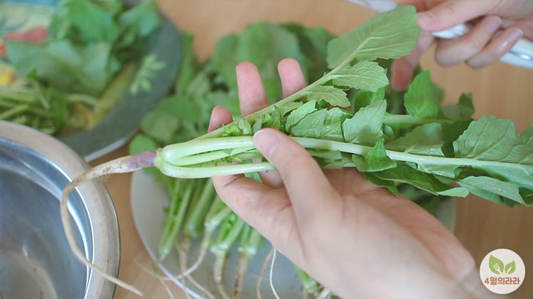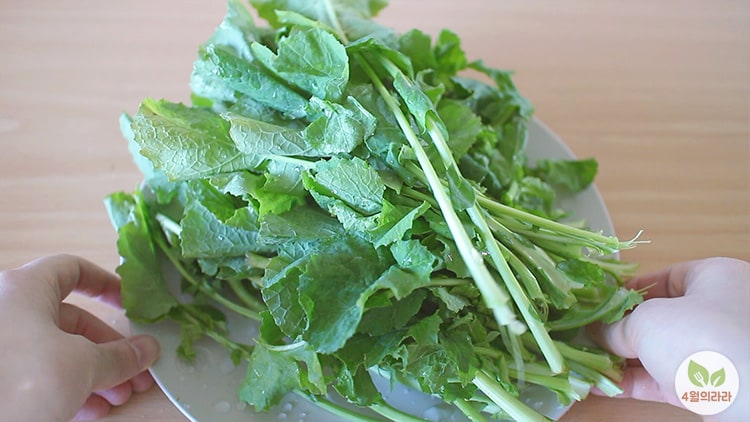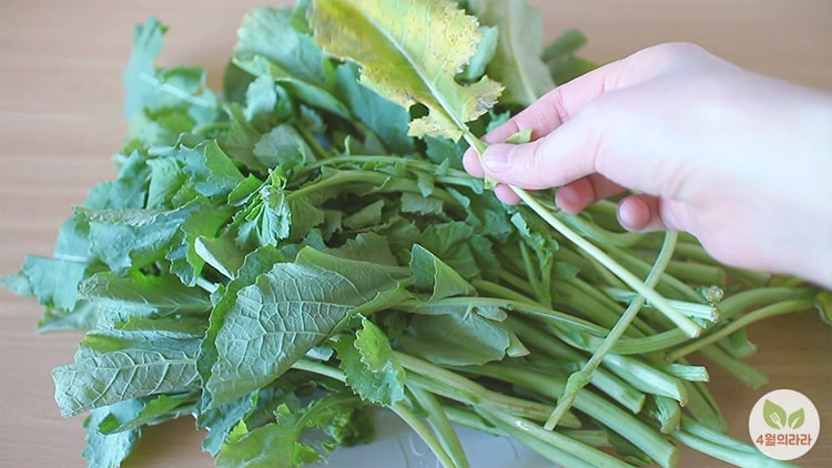 이제 유채나물 만들어 볼까요. 누렇게 시든 것만 골라내고 물에 씻어주세요.