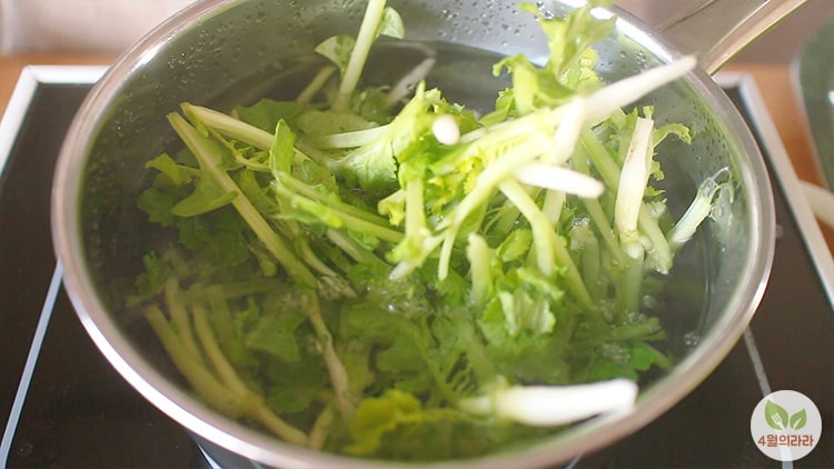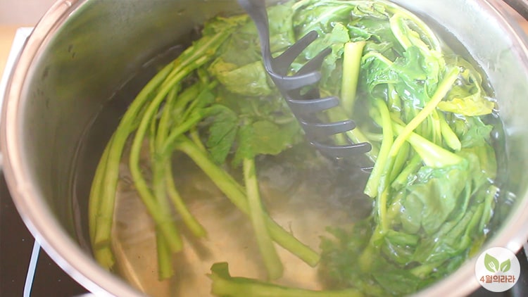 끓는 물에 소금을 넣고 손질하고 씻어놓은 열무의 줄기 부분부터 넣어 데칩니다. 데친 후 찬물에 헹궈 물기를 꽉 짜주세요.