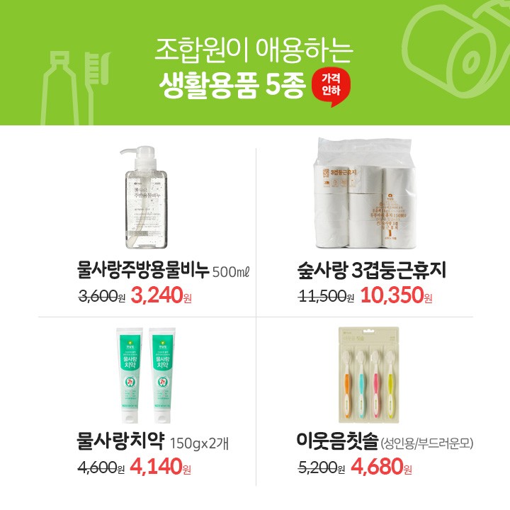 주방세제는 십여년이 넘게 꾸준히 사용하고 있고, 치약과 휴지, 비누도 좋아요.