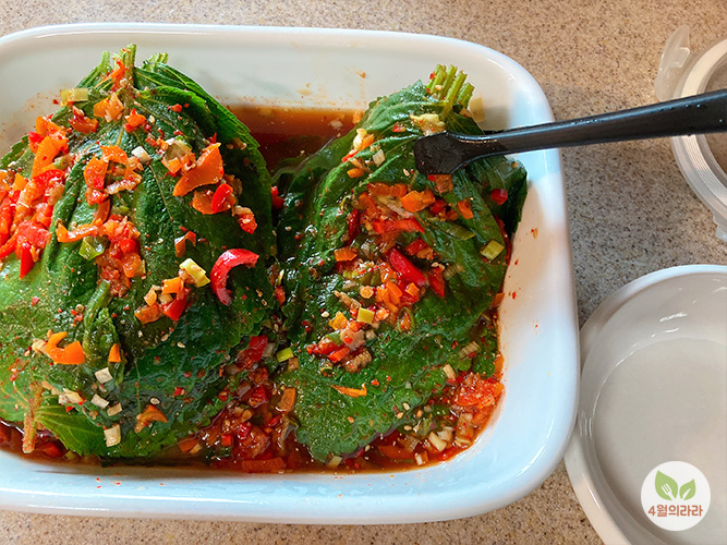 위쪽의 깻잎과 아래쪽 깻잎의 자리를 바꿔주었어요.