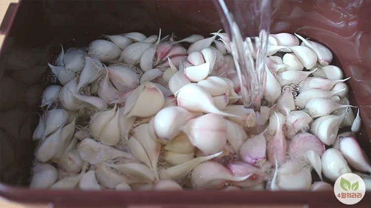 통에 마늘을 다 쏟아붓고 소금물을 부어줍니다.
