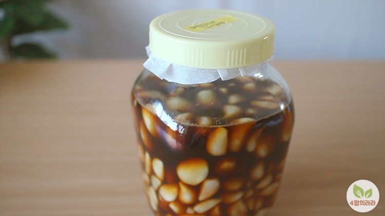 껍질을 까서 마늘장아찌를 만들면 먹을 때마다 껍질을 깔 필요가 없으니 편합니다. 이리 담가두면 1년 반까지는 실온에서 보관해도 상관없어요. 일 년 내내 약이다 생각하고 먹고 있습니다.