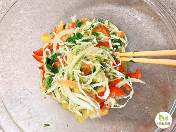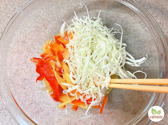 채소는 냉장고에 돌아다니는 자투리채소 모두 넣어주세요. 전 파프리카와 양파, 양배추를 넣어주었어요. 막상 먹어보면 양배추가 많이 들어간게 훨씬 맛있었습니다.