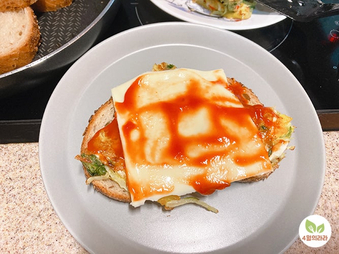 달걀부침과 치즈를 올리고, 케첩을 뿌린 후 다시 달걀부침을 올린 후 빵으로 덮어줍니다.