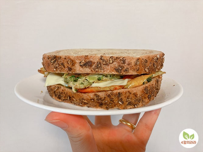 오늘은 식빵보다 살짝 건강한 호밀빵으로 만들어봤는데, 이것도 맛있더라고요. 치즈가 녹을 정도의 계란채소부침이 들어가는게 뽀인트~ 자아~ 시작합니다.