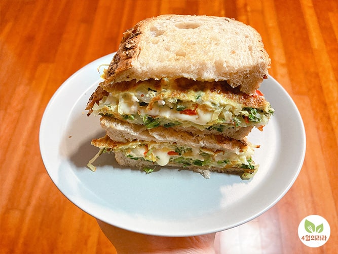 재료: 호밀빵 4장, 달걀 2개, 양배추, 파프리카, 양파, 데친 참나물, 치즈, 소금, 후추, 씨겨자, 케첩