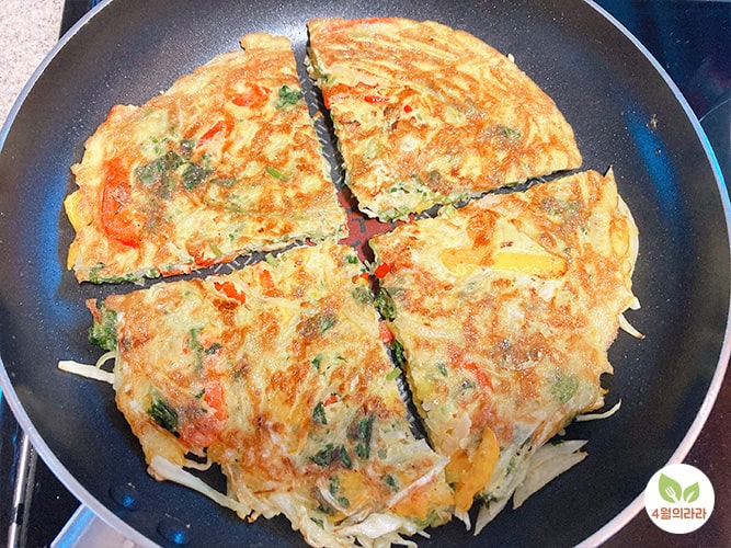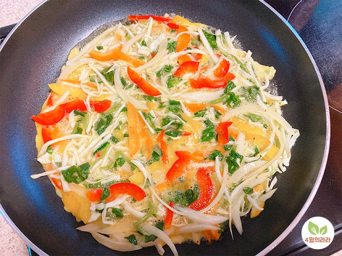 3. 풀어놓은 달걀에 채소를 넣어 골고루 섞은 후 팬에 부친다. 4등분으로 자른다.