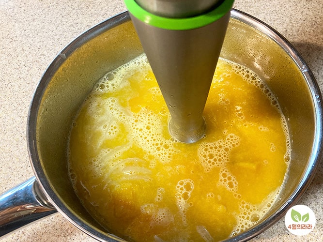 단호박이 숟가락으로 눌렀을때 으깨질 정도가 되면 블렌더 이용해서 갈아줍니다.