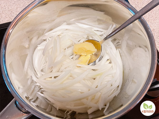 스프나 카레에 들어가는 양파는 천천히 오래 볶아야 맛있어요. 양파에서 단맛이 많이 나올수록 음식이 맛있어집니다. 오늘도 스프니깐 양파를 볶아야 하는데, 오래 볶을 시간은 안 되니 투명할 정도까지만 볶아볼게요. 썰어놓은 양파에 버터를 넣어 볶아주세요.