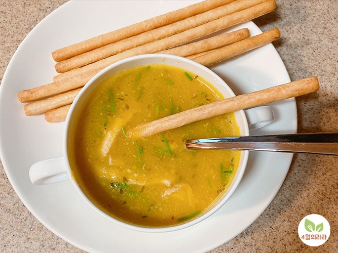 스프도 떠먹고, 그리시니를 찍어 먹기도 하고 먹다 보면 그리시니의 씹히는 맛이 좋아서 계속 먹고 있다는 사실~ 정말 맛있어요.