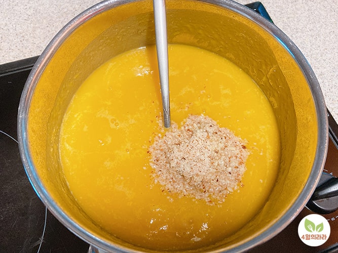 아몬드 갈아서 넣어주면 씹히는 식감도 있고, 맛도 고소해져요. 견과류 남은 거 있으면 스프나 죽 끓일 때 넣어 보세요. 맛있습니다.