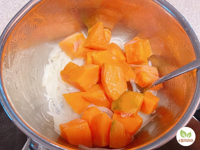 양파가 투명해지면 단호박을 넣어주세요. 이 단호박은 몇 주전에 산건데, 당도가 좀 떨어진 거라 손질해서 냉동실에 얼려두었던 거예요. 단호박스프 만들 때 꺼내 쓰기 딱 좋습니다. 냉동상태에서 바로 넣어 뚜껑 덮어 천천히 익혀주셔도 좋고, 전자레인지에 넣어 미리 어느 정도만 익혀주셔도 조리시간을 단축할 수 있습니다. ^^