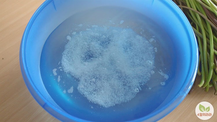 1. 고구마줄기 절이기 - 절임물에 넣어 2시간 절인다