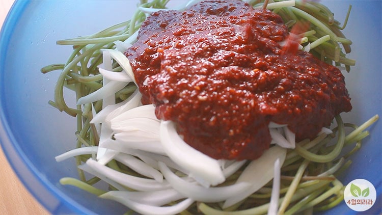 4. 고구마줄기에 채 썬 양파, 양념을 넣어 살살 뒤적여 버무린다