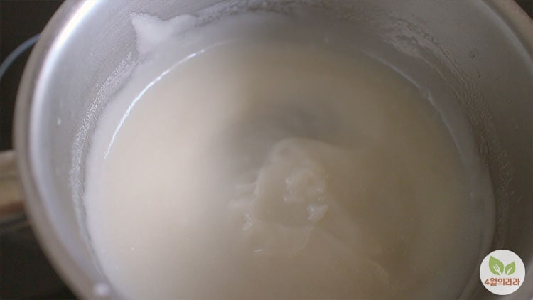 김치풀을 쑤는데, 육수 2/3컵에 찹쌀가루 1T(수북하게) 넣어 먼저 풀어주세요. 불에 올리기 전에 찹쌀가루를 풀어주면 잘 풀리니 꼭 미리 풀어주세요. 육수 대신 맹물도 가능하고, 불 위에 올려 죽처럼 맑아지면서 거품이 크게 떠오를 때까지 익혀줍니다.