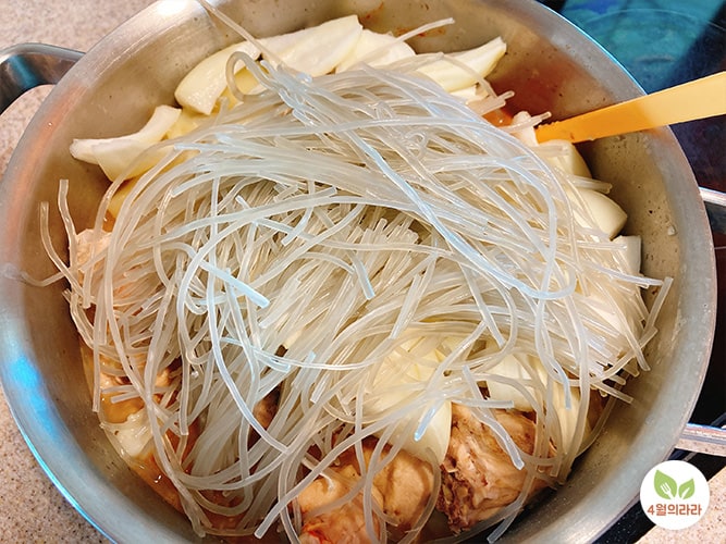 닭과 감자, 무, 당근, 떡볶이 떡을 넣어 끓입니다. 감자가 익을 정도가 되었을 때 양파와 불린 당면을 넣어줍니다.