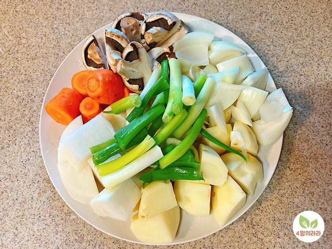함께 들어갈 재료들 준비했는데, 감자와 무, 양파와 당근, 양송이버섯과 대파 먹기 좋은 크기로 모두 잘랐습니다. 그리고 불려놓은 떡볶이 떡과 당면도 준비해두었어요.