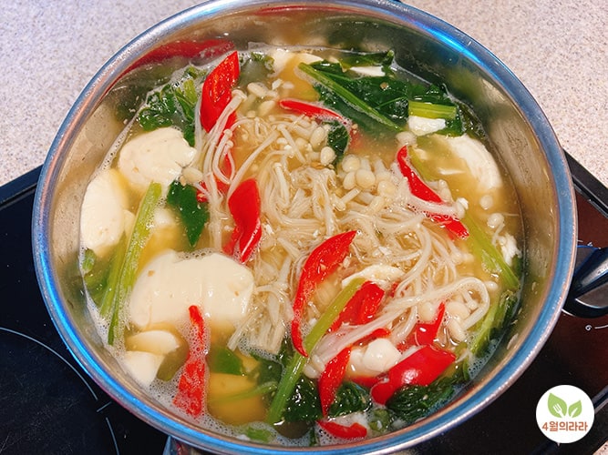 부드러운 근대와 잘 어울리게 보들보들 순두부와 팽이버섯을 넣고, 색을 살리기 위해 붉은고추도 썰어 넣었습니다.