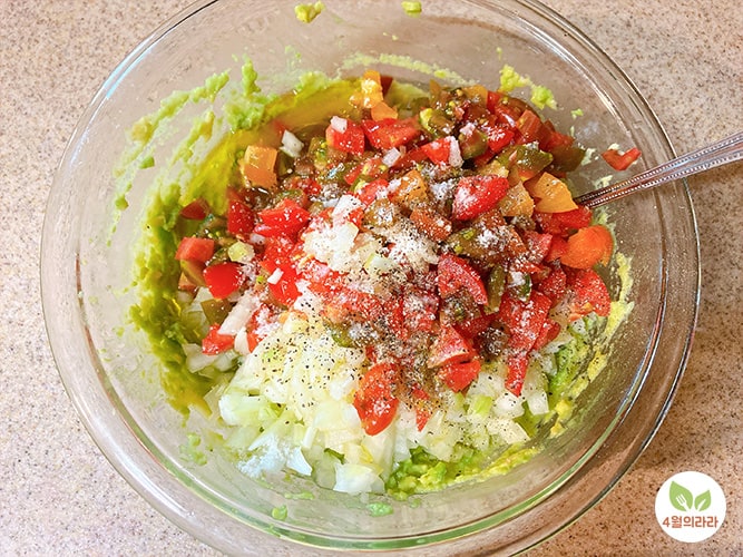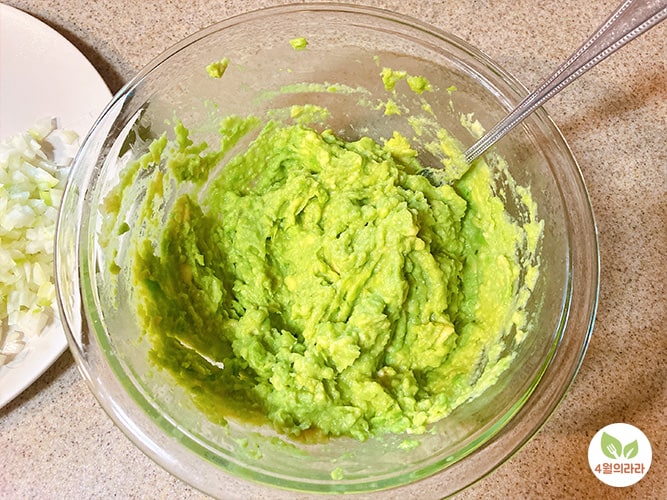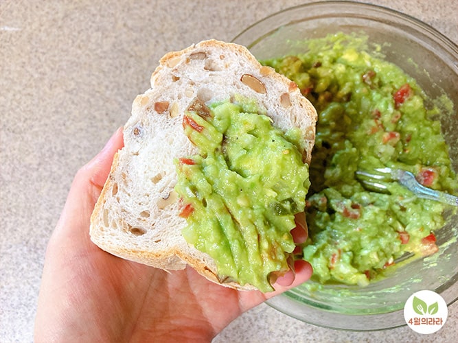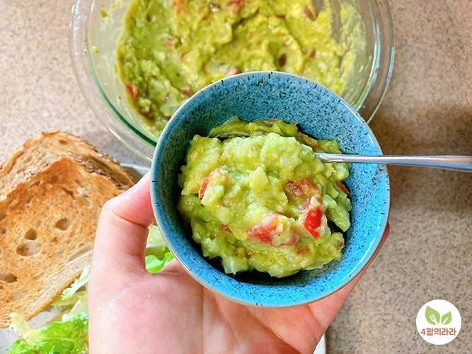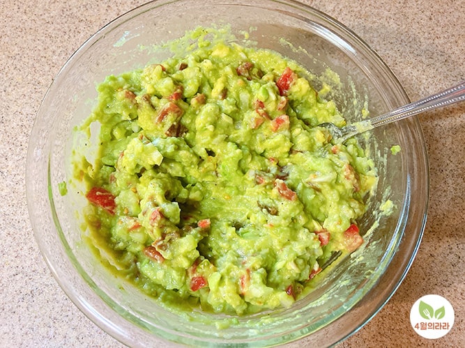 모두 골고루 섞어주면 과카몰리 완성~ 과카몰리 만들어두면 빵에도 좋지만, 우리나라 기정떡이나 백설기랑 먹어도 맛있어요. 물론 과자 찍어먹는 딥으로도 참 좋습니다. 옆지기는 이거 좋아해서 밥반찬으로도 먹는답니다. ㅋㅋㅋ