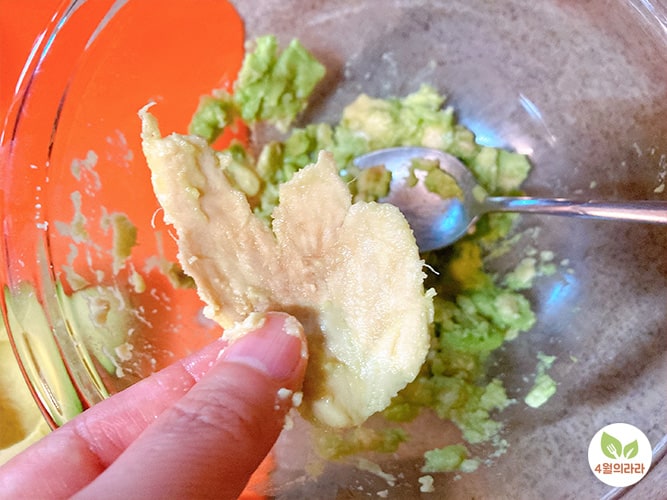 아보카도 과카몰리를 만들려면 먼저 으깨줘야 해요. 가끔 안쪽에서 이런 덩어리가 나오는데, 이건 모두 버려주세요.