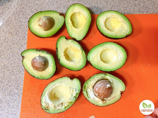 잘 익은 건 칼이 쉽게 들어가고 숟가락으로 쉽게 떠집니다. 씨는 칼로 찍어 빼내주세요. 참, 아보카도는 칼로 자르기 전에 물로 씻어주세요. 전 채소도 씻을 수 있는 세제를 이용해 닦아줍니다.
