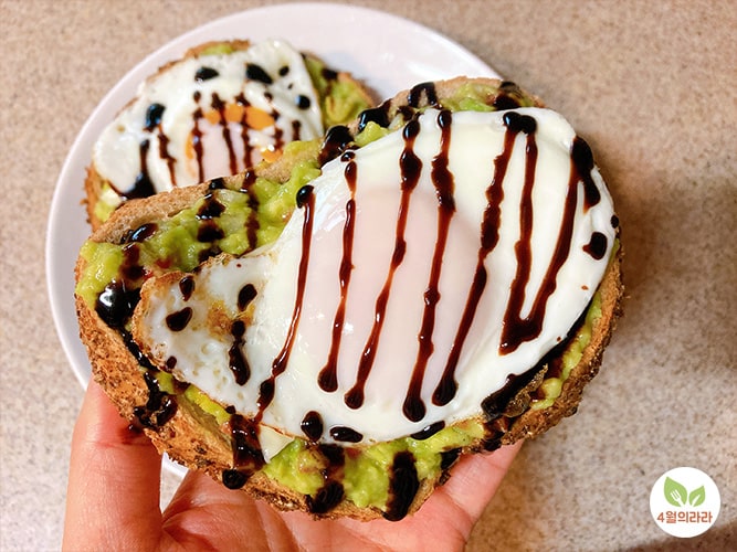 빵에 과카몰리를 올리고, 치즈를 올리고 방금 부쳐낸 계란후라이를 올려줍니다. 따뜻한 후라이 덕에 치즈가 녹아서 맛있어요. 위에 뿌린건 발사믹 글레이즈 같지만, 사과농축식초에요. 요즘 요거요거 먹는 재미에 푹 빠졌답니다.
