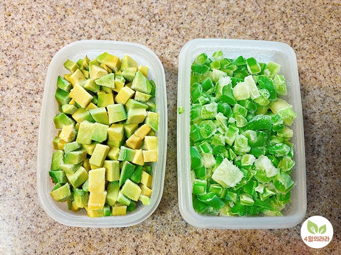성질 급해서 칼을 넣어 자르는 순간, 안 익었다... 싶을 때가 있죠. 이미 칼은 들어갔고, 이를 어쩌나... 고민 될 텐데요. 덜익은 아보카도를 먹으면 배탈이 나기도 한다니 드실 때 꼭 익혀드세요. 위 사진 초록색 두 가지가 뭔지 아시겠어요? 왼쪽은 덜익은 아보카도이고, 오른쪽은 브로콜리몸통이에요. 요렇게 칼로 잘라 냉동실에 보관해요. 볶음밥이나 카레 등 요리할 때 넣어 활용합니다. 덜익은 아보카도는 냉동실에 보관했다가 볶음밥이나 카레에 넣어 드세요. ^^