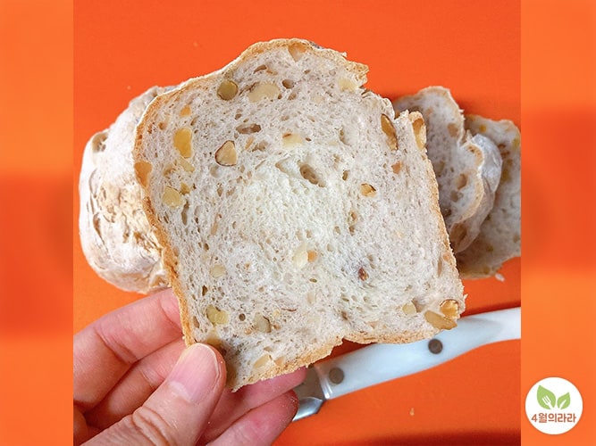 생협에서 산 넛츠브래드란 빵이에요. 글루텐 함량이 낮은 밀가루를 사용했고, 밀가루의 양 자체를 줄이고, 고소한 건과류를 듬뿍 넣어 만든 빵이랍니다. 밀가루를 줄여야 하는 옆지기는 이빵으로 오픈샌드위치를 만들어 줄거에요.