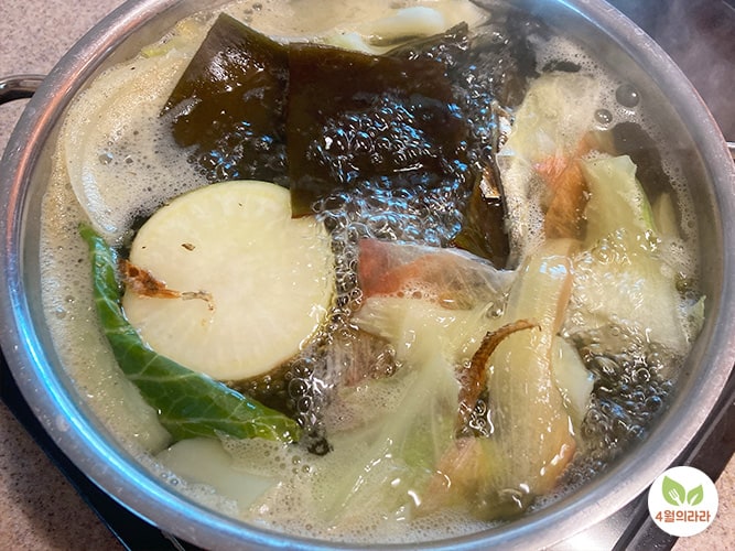 3. 자투리채소와 양배추를 넣고, 뚜껑을 덮어 5분간 더 끓인 뒤, 불을 끄고 10분 그대로 둔다.