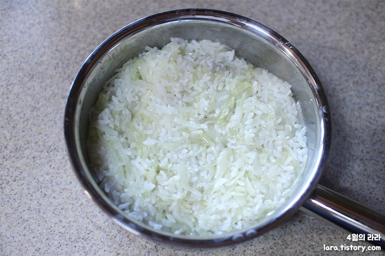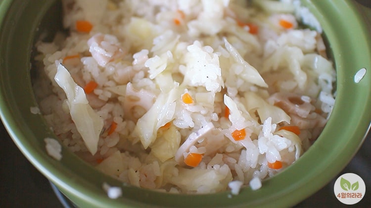 10분 뒤 완성된 양배추밥, 양배추의 형태가 살아있어 식감이 있어 적당히 씹을 수 있어 좋아요.