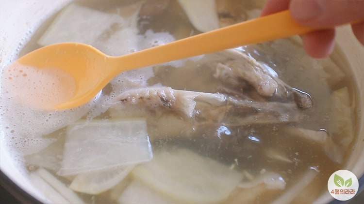 4. 냄비에 육수를 붓고 무를 넣어 끓이다가 끓어오르면 대구를 넣어 끓인다. 떠오르는 거품은 모두 걷어낸다.