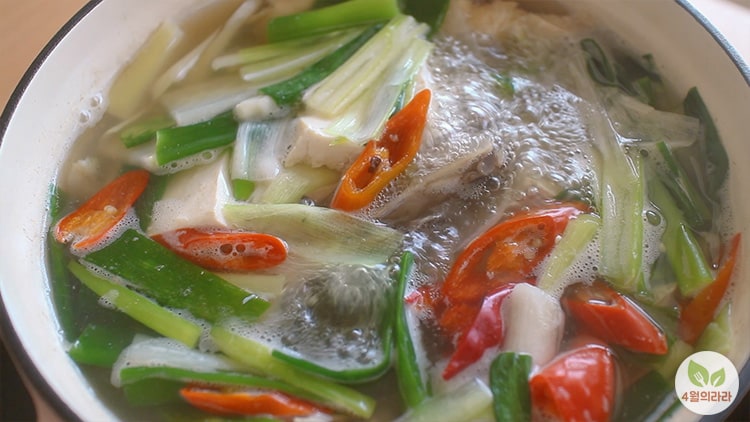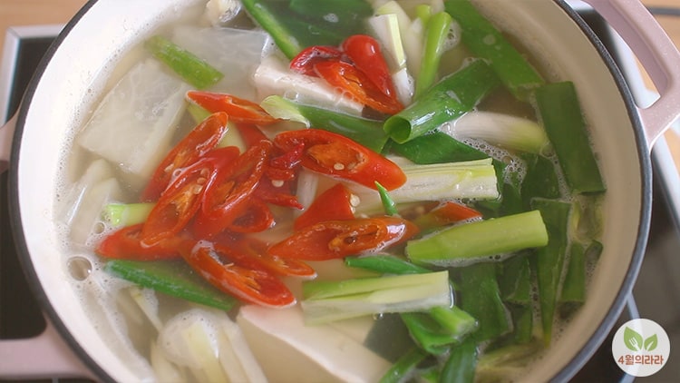 거품을 모두 걷어내고 두부와 대파, 붉은 고추를 넣어줍니다.