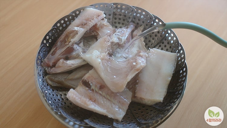 3. 대구의 지느러미를 잘라내고 먹기좋은 크기로 자른 후 끓는 물을 끼얹어 준다.