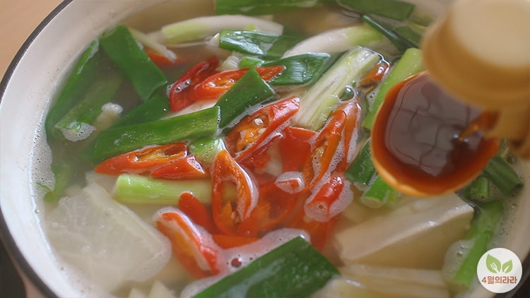 이제 간을 맞추는데, 전 까나리액젓과 국간장을 넣었어요. 까나리액젓은 감칠맛을 살리는 역할로 조미료 대신 활용할 수 있습니다. 다른 국에도 조금씩 넣어보세요. 조미료 넣은 것처럼 감칠맛이 살아납니다. 담백하게 먹기 위함이니 소금으로 간을 해도 좋고, 저처럼 국간장으로 간을 해도 좋아요. 전 액젓 1T, 국간장 2T를 넣었지만, 액젓이나 국간장이나 재래식으로 만드므로 짠기가 다르니 직접 간을 보는 게 좋습니다.