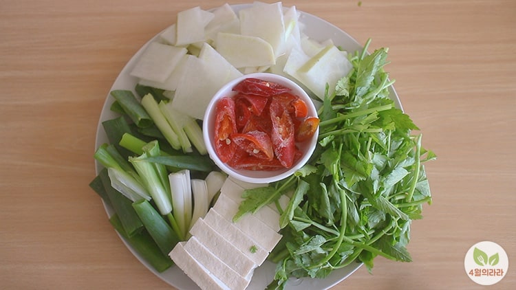 2. 무, 미나리, 두부, 대파, 붉은고추 모두 먹기 좋은 크기로 자른다.