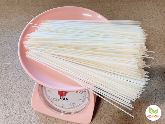 쌀국수 2인분 준비합니다. 전 170g 준비했어요. 옆지기나 저나 양이 많지 않으니 이 정도만... 보통 소면 1인분은 100g 정도이고, 더운나라 쌀국수 종류는 1인분에 7,80g 정도인데 이게 양이 적더라고요. 이런 종류는 100g까지도 준비하면 일반적으로 좋을 것 같아요.