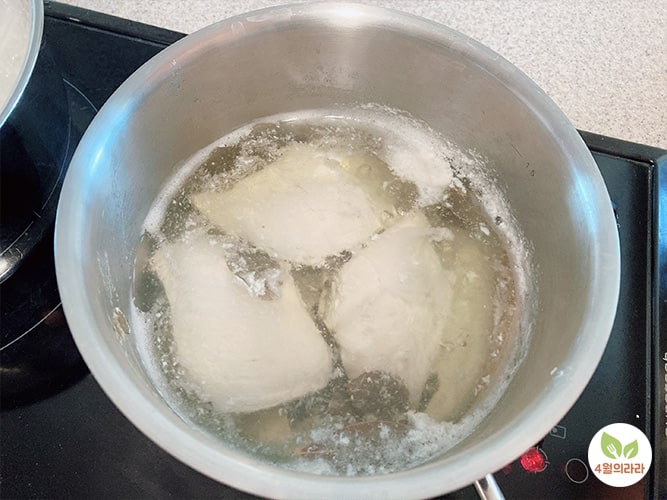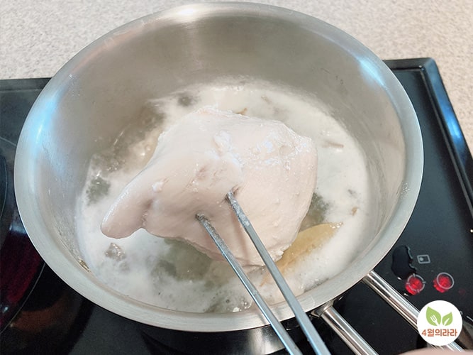 닭가슴살(300g)이 잠길 정도의 물을 붓고, 청주 1T, 월계수 잎 2,3개, 통후추 10알을 넣고 끓여줍니다. 끓기 시작하면 중약불로 낮추고 떠오르는 거품은 모두 걷어내 주세요. 10분 정도 삶아줍니다. 센 불이 아니라 중약불에서 천천히 익혀야 부드러운 닭가슴살을 드실 수 있어요. 청주 없을 때 미림이나 남은 와인도 괜찮습니다. 손가락 길이 정도의 대파를 2쪽 정도 넣어주어도 좋습니다.