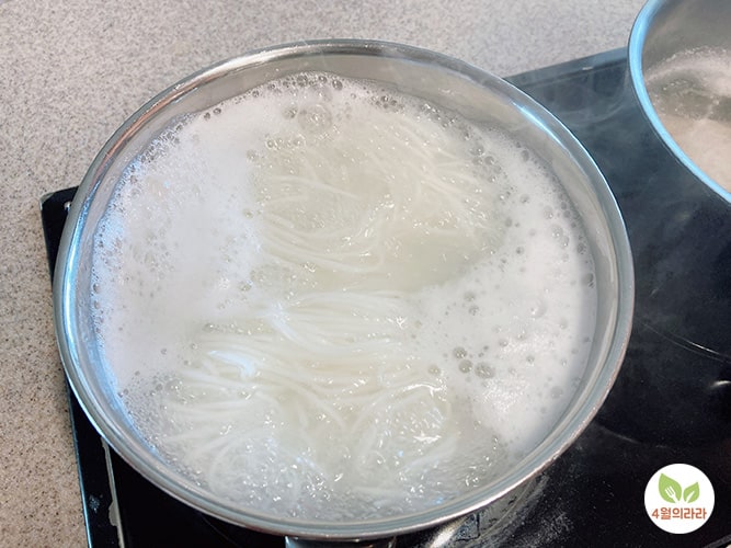 펄펄 끓는 물에 소금을 약간 넣고 국수를 넣어요. 사진처럼 끓어오르면서 넘치려고 할 때 물 반 컵 정도를 넣어줍니다. 이 과정을 한 번 해주고, 다시 끓어올라 넘치려고 할 때 체에 받혀 찬물에 헹궈주시면 됩니다. 일반 밀국수도 같은 방식으로 하면 됩니다.