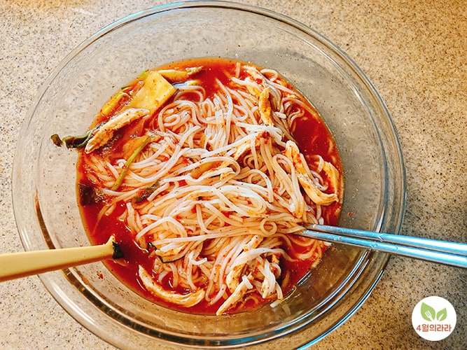 잘 섞어주고, 국수랑 국물이랑 전반적인 맛을 보세요. 새콤달콤 원하는 맛이 되었는지 말이죠. 모자라면 추가해주고, 넘치면 육수를 더 넣어주세요. 참, 육수 없음 그냥 물로도 괜찮아요. 물을 넣는다면 약간의 조미료의 도움을 받는 것도 좋습니다.